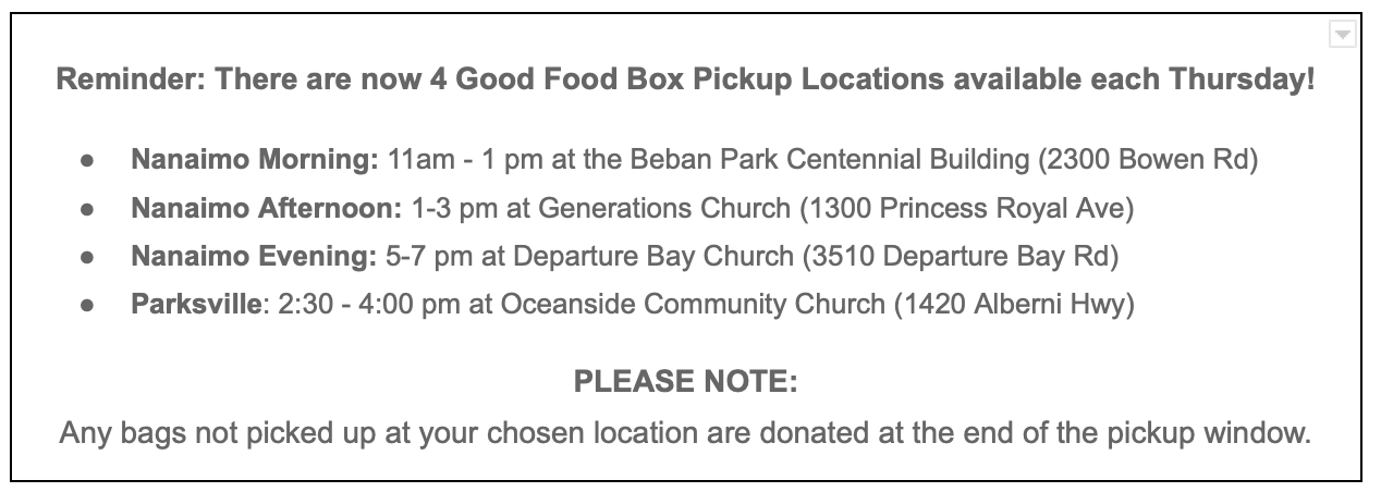 Growing Opportunities is a wonderful team of urban farmers and volunteers dedicated to sharing agricultural skills, growing good food and supporting Nanaimo’s food system. They support the Good Food Box program by providing as much of our produce as possible through the year at discounted rates.