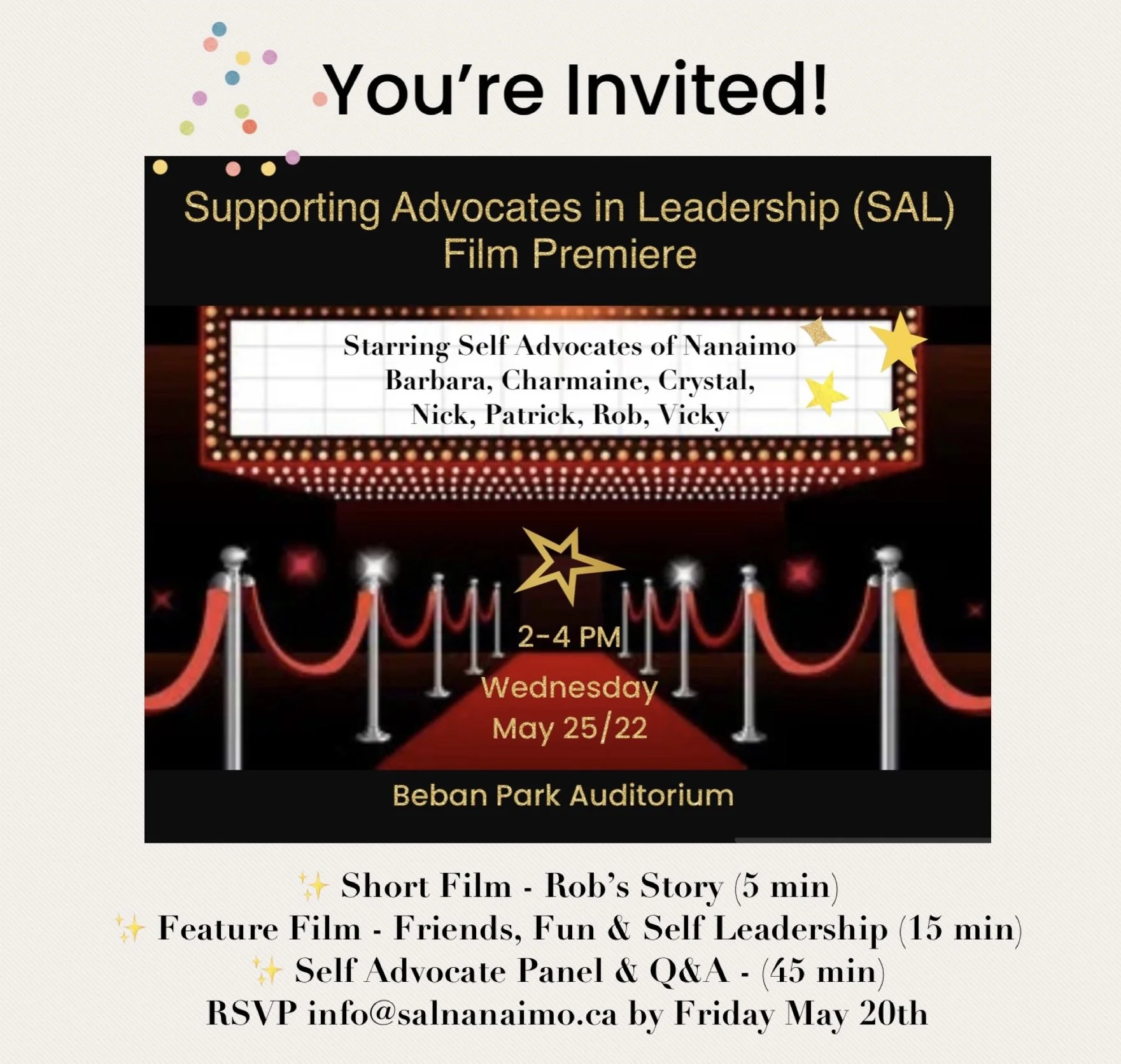 Please help us support the Self Advocates of Nanaimo and their key message of self leadership! Bring a friend (or two), share this invite with others.