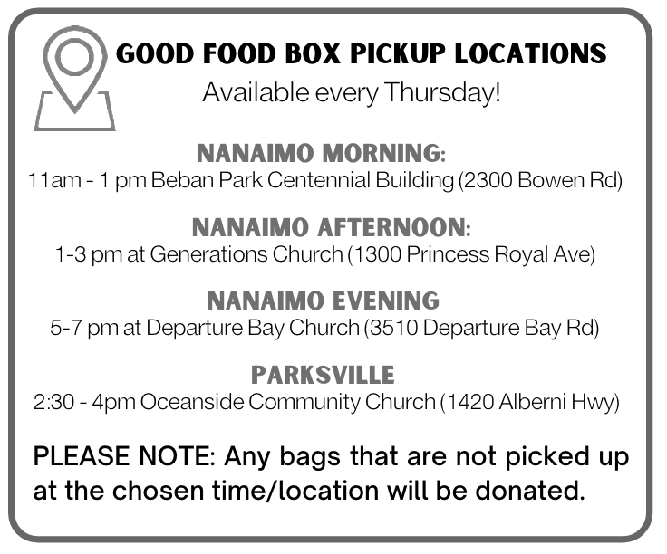 Growing Opportunities is a wonderful team of urban farmers and volunteers dedicated to sharing agricultural skills, growing good food and supporting Nanaimo’s food system. They support the Good Food Box program by providing as much of our produce as possible through the year at discounted rates.